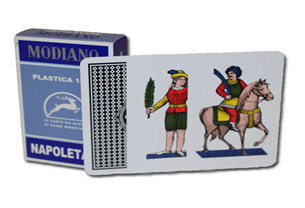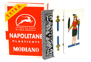 This deck of authentic Italian Cards is known as the Napoletane deck from the Spanish Regional style of Italian playing cards. This deck is produced by Modiano and imported direct from Italy. The Spanish style decks are primarily used in the southern half of the country including the island of Sicily. They feature the Spanish style suits of coins, cups, swords and batons (also known as clubs). There are 40 cards in each deck. This regional style features a full range of colors. The images are full with ornate details and the use of shading gives the playing cards a life like appearance. The actual card sizes tend to be wider than the northern Italian cards, but are still a little smaller than their US counterparts.