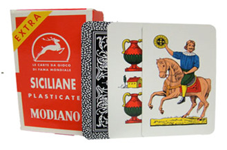 This deck of authentic Italian Cards is known as the Siciliane deck from the Spanish Regional style of Italian playing cards. This deck is produced by Modiano and imported direct from Italy. The Spanish style decks are primarily used in the southern half of the country including the island of Sicily. They feature the Spanish style suits of coins, cups, swords and batons (also known as clubs). There are 40 cards in each deck. This regional style features a full range of colors. The images are full with ornate details and the use of shading gives the playing cards a life like appearance. The actual card sizes tend to be wider than the northern Italian cards, but are still a little smaller than their US counterparts.